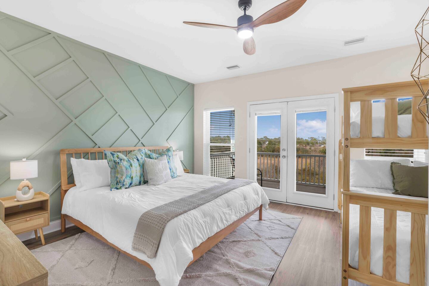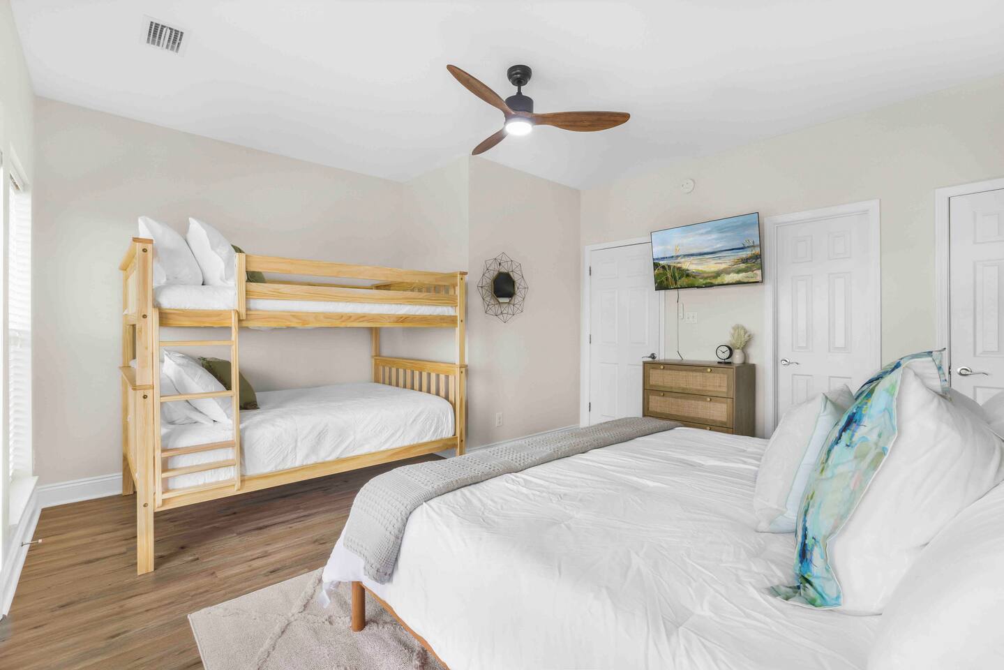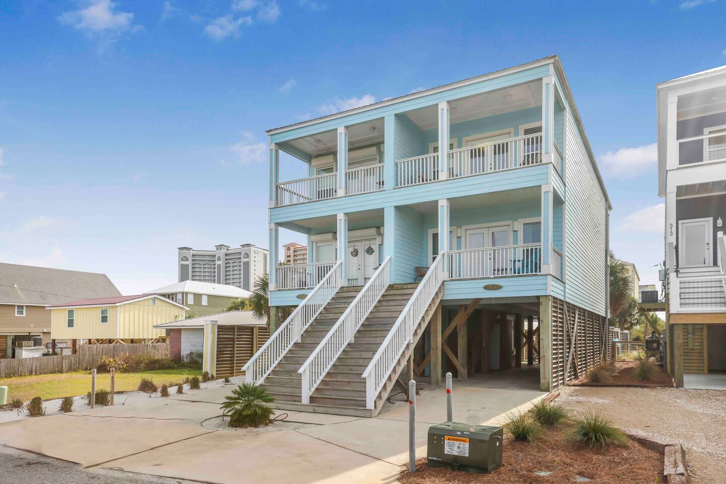 Take in the coastal atmosphere at Blue Tide! This spacious 3 bedroom, 3 bathroom house has everything you could possibly want and more. Relax with us this vacation with top-quality furnishings, decor, and electronics, you'll have all the comforts of home. Wi-Fi access is available throughout the house. The kitchen is fully stocked for all of your cooking needs. The open floor plan to dining room and living room assist in making sure you never miss a moment of time with friends and family. You can enjoy your morning coffee on back deck overlooking the pool or enjoy afternoon lunch on the front porch with your loved ones. The 4 decks offer a comfortable living/dining area to provide a fantastic option for relaxation and food. Enjoy an experience in a magical, relaxing atmosphere during your one of a kind stay with Blue Tide! The open living room invites you to sit back and appreciate time with the most important ones, read a book, play a board game, watch television or just be. The bedroom on the first floor is equipped with twin over full bunk bed and a full hall bathroom. Upstairs, the master bedroom offers a king-sized bed, an ensuite bathroom a calming view of the pool and partial ocean view. Soak in the tub or relax in a hot shower after a long day at the beach. The guest bedroom furnishes a king- sized bed and full over full bunk beds and is met with an en-suite bathroom overlooking the marsh. You'll appreciate the tranquility of Blue Tide - a short walk to the beach. Close to several hotspots around town like The Hangout, Sunliner Diner, Picnic Beach, The Gulf, The Factory trampoline park, Bier Shack Tap Room, Wildflowers Boutique and Zeke's Landing fishing charters. We look forward to you staying in Blue Tide, your piece of white sand paradise! Bedroom 1: King Bedroom 2: King + Full over Full bunks Bedroom 3: Twin over full bunks Queen Sleeper Sofa In the event of a hurricane: Only under mandatory evacuations are payments fully refundable. Trip insurance recommended during hurricane season. Must be 21 to book and must be present.