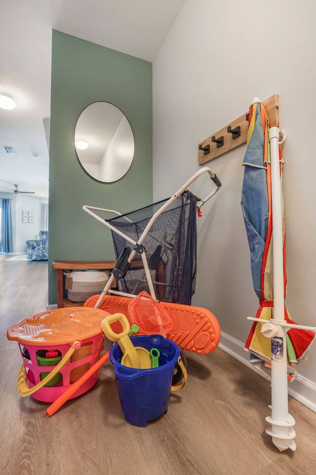 - Beach essentials Beach towels, umbrella, beach blanket, snorkeling gear